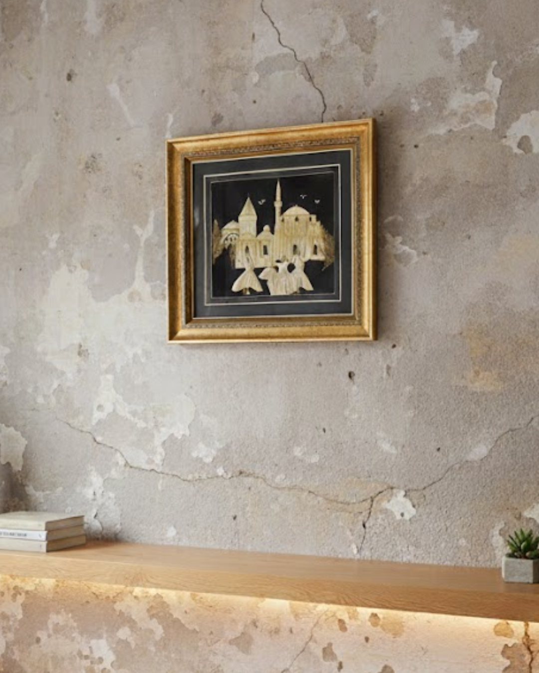 Anadolu’nun köklü kültürünü ve tasavvufun huzur veren ruhunu yansıtan bu el yapımı Mevlânâ ve semazen temalı tablo, tamamen ustalıkla hazırlanmış özel bir sanat eseridir. Doğal malzemeler kullanılarak yapılan kakma işçiliği sayesinde her tablo benzersiz ve tek parçadır.